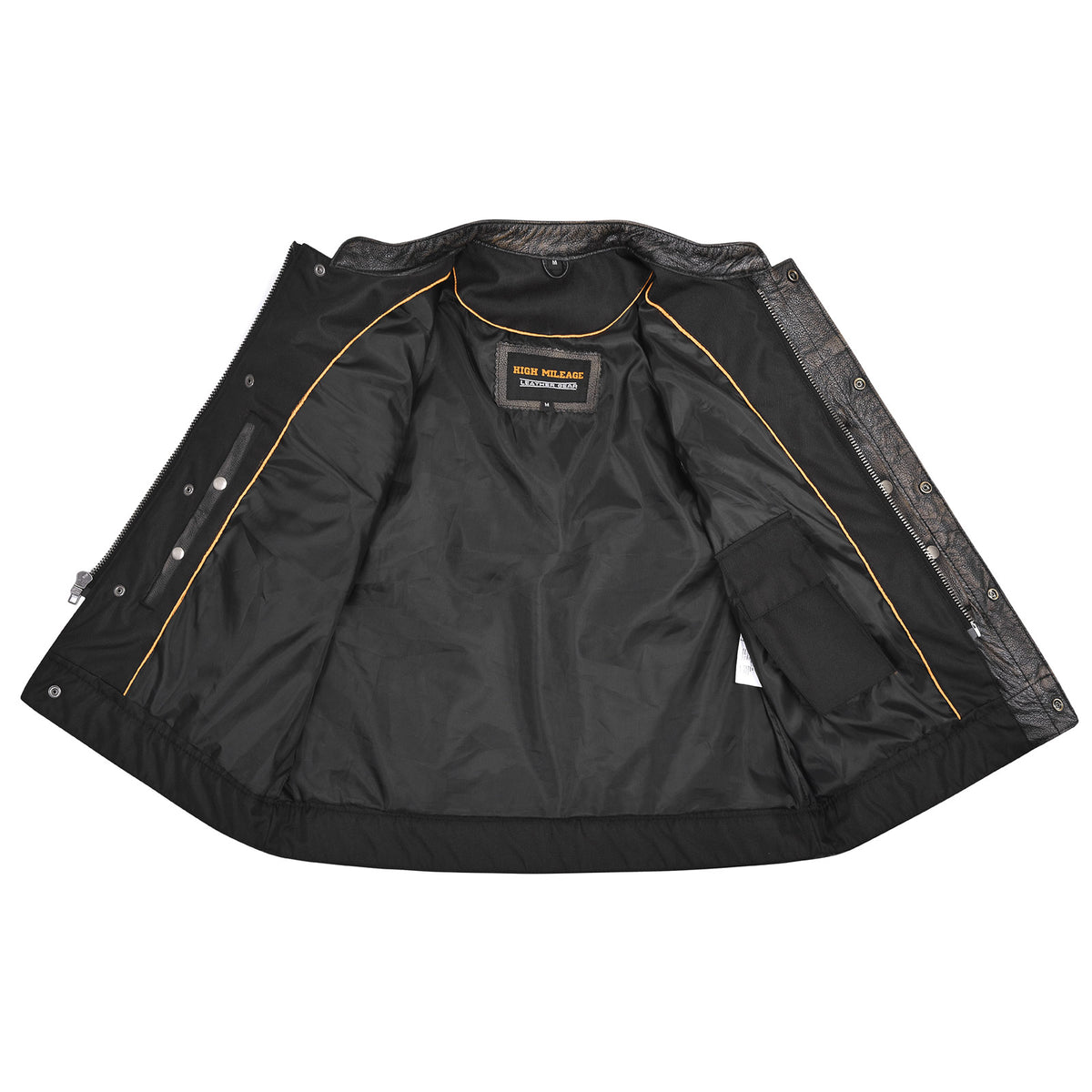 The High Mileage HMM914DB is crafted from ultra-premium cowhide leather and exudes a rugged and timeless appeal that is built to last. The five snaps with zipper front closure not only ensure a secure and comfortable fit but also add a touch of sophistication to your biker ensemble. The fixed polyester and nylon liner with orange trim provides a reliable layer of insulation and enhances the vest's overall aesthetic.