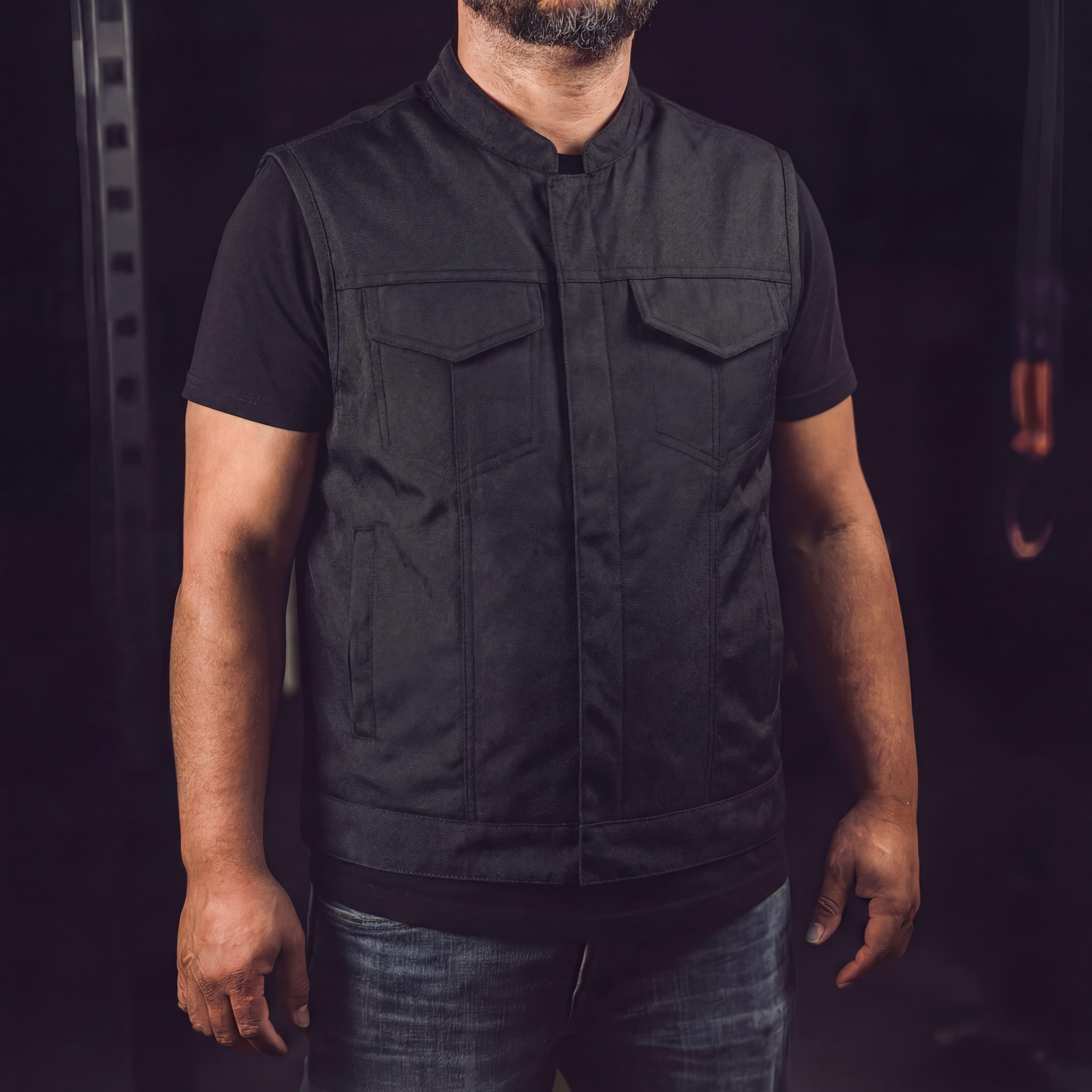 VL1919 - Mens Premium Collarless Textile Motorcycle Vest Heavy Duty SOA Club Style Vest w/ Front Zipper and Snap Closure