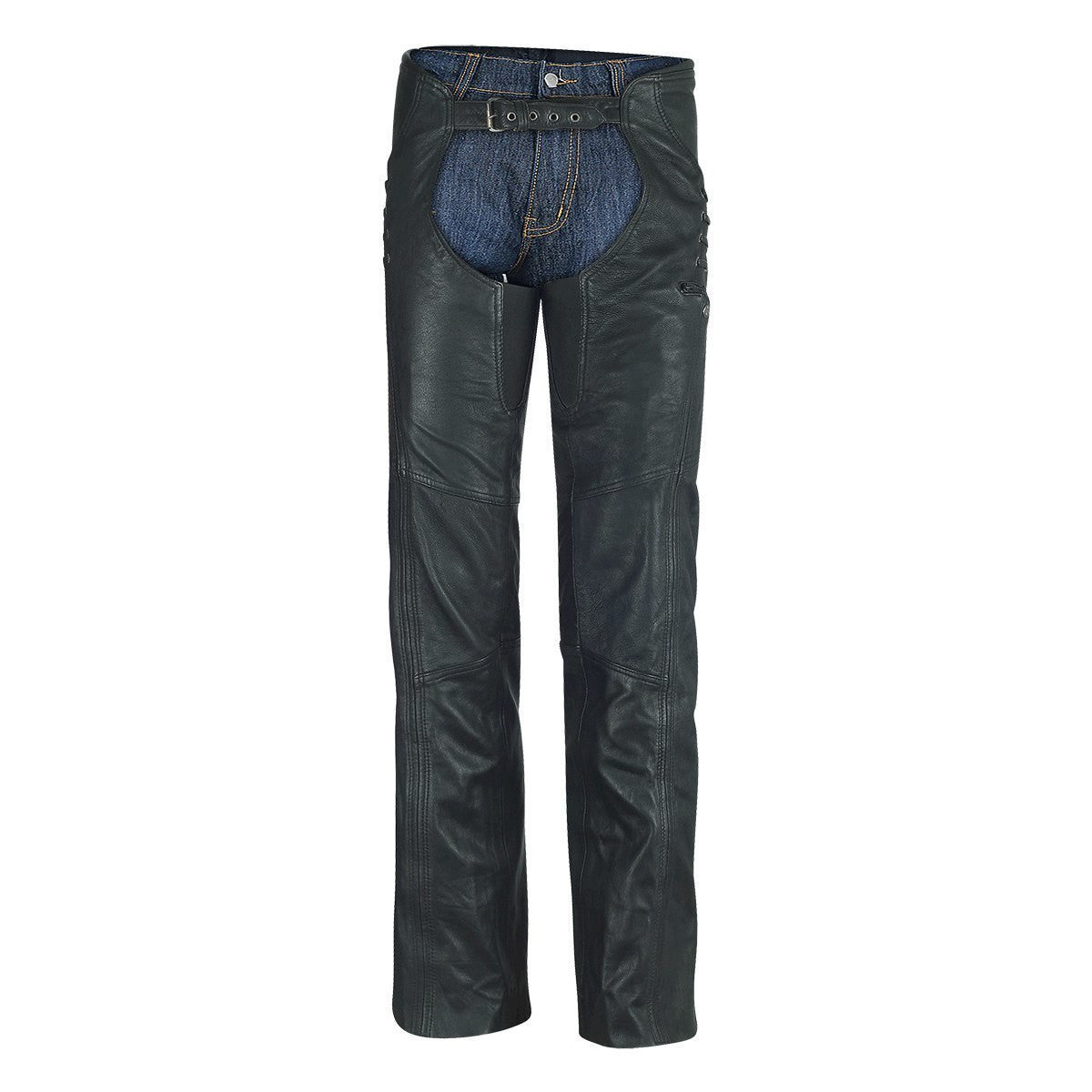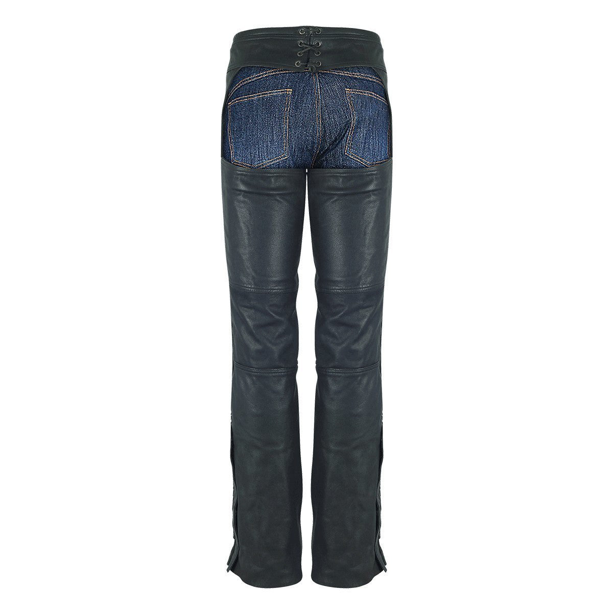 High Mileage HML838B Womens Black Premium Top Grain Goatskin Lady Biker Motorcycle Leather Chaps with Grommeted Twill and Lace