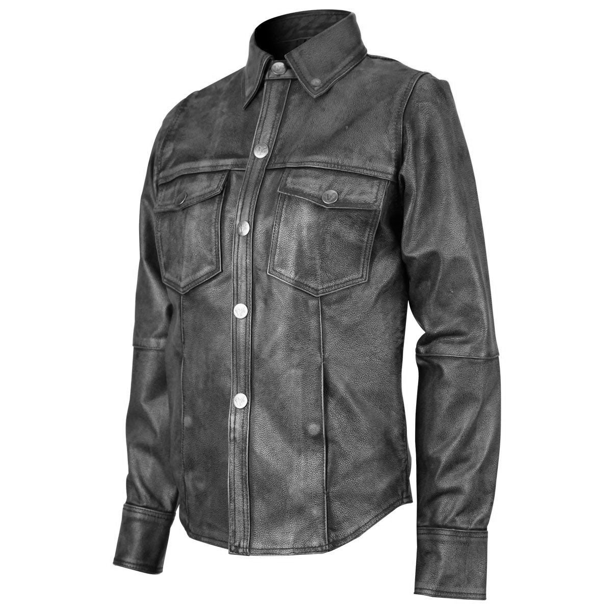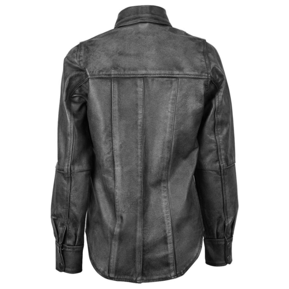 The Women's black lambskin Leather Shirt is a must have for the ladies. This is a great casual look with a tough feel. Features multiple pockets for those personal items the ladies love to carry. But don't be misled. It also features an inside gun pocket so don't get too close; she may be packing