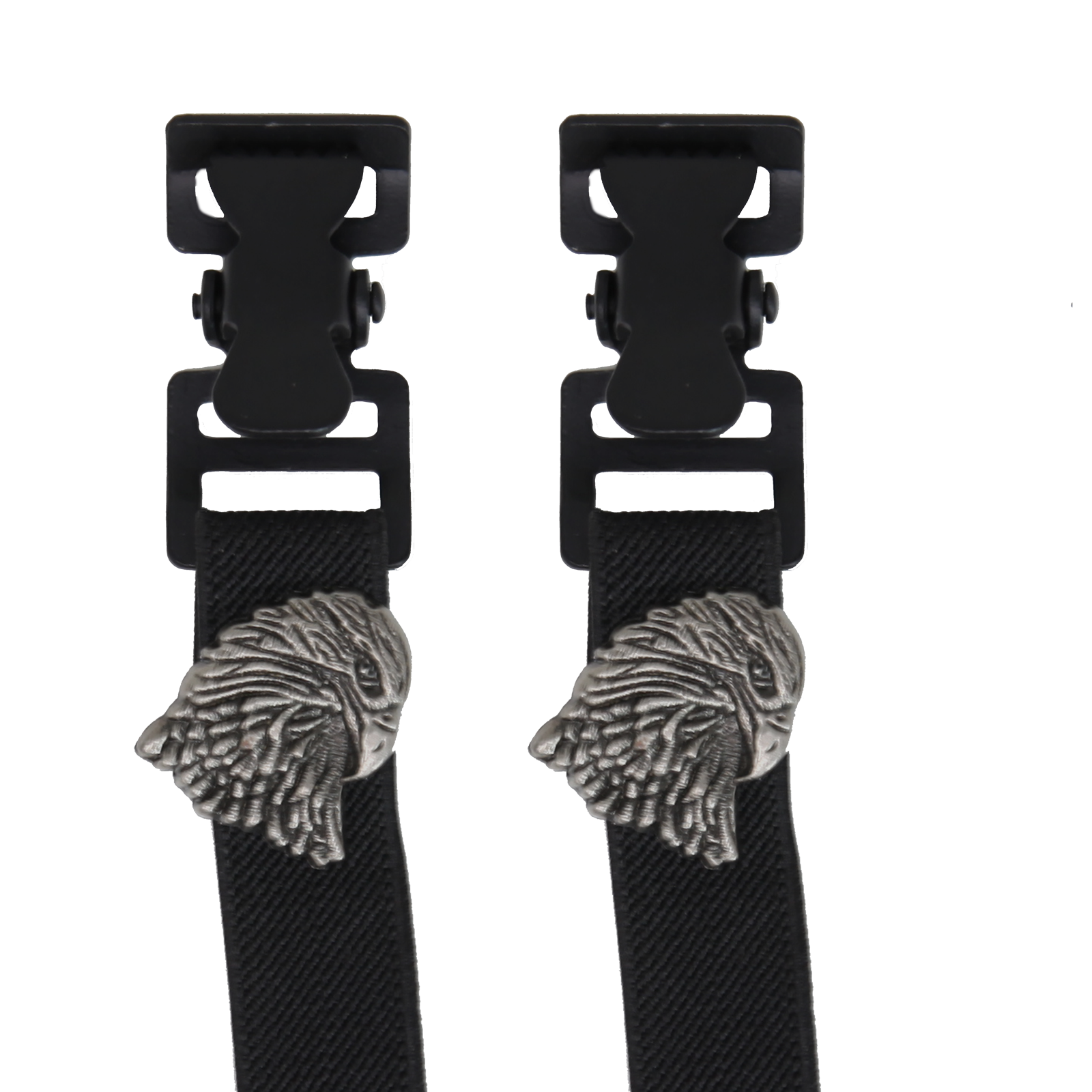 These Adjustable Riding Pant Clips Are Made of Black Stretchable Bungee Material and Black Heavy-Duty Clips.