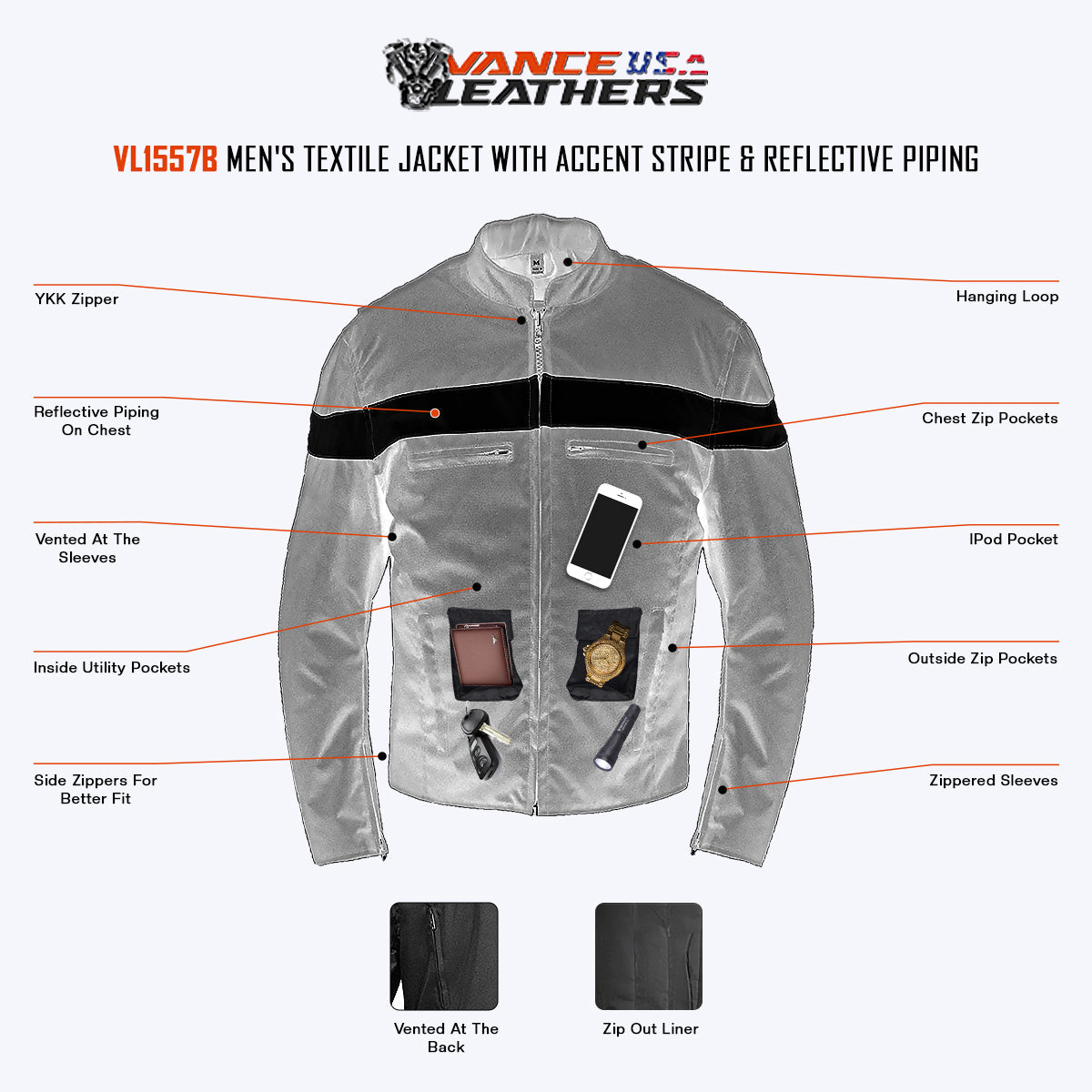 This men’s textile jacket has a reflective accent stripe and piping on the sleeves. Front and rear zippered vents help keep you cool when it is hot and the zip out liner will give you the extra layer when the temperatures drop. Zip up pockets inside and out round out this special jacket.